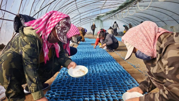 走进香瓜大棚,一股暖意扑面而来,湿润的空气中弥漫着泥土的芬芳。工人们熟练地进行着香瓜下籽工作。她们分工明确,有的装填营养土,有的则将一粒粒饱满的香瓜种子点播在育苗盘中。大家手法娴熟,指尖翻飞间,一排排播种好的育苗盘整齐地排列在地上,静待发芽。